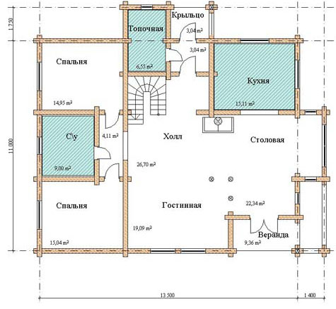 Деревянный дом из оцилиндрованных бревен. Проект отличает просторная планировка, большая общая комната на первом уровне со вторым светом, совмещенная со столовой.