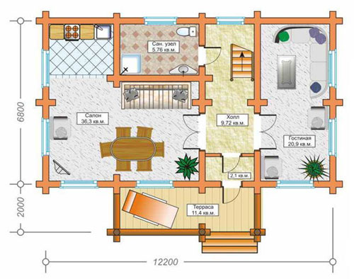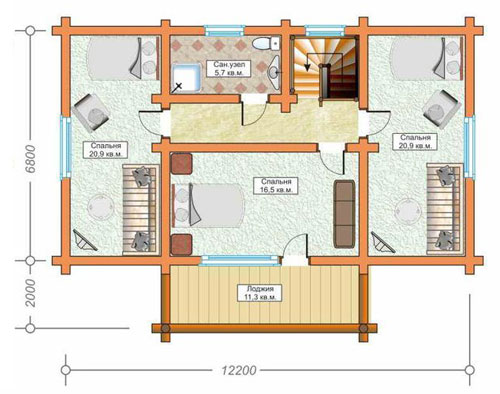 Компактный и удобный деревянный дом из бревна. Основной вход расположен по центру строения. Входная группа образует веранду, а на втором уровне - балкон. Внутреннее пространство спроектировано рационально. Первый уровень, это традиционно общие помещения: кухня, столовая, гостиная. На втором этаже расположены 3 спальни и санузел.