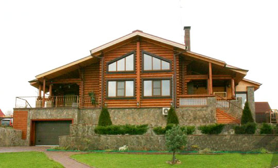 Интересный коттедж из оцилиндрованного бревна, сочетающий элементы стиля шале и черты современной деревянной архитектуры.