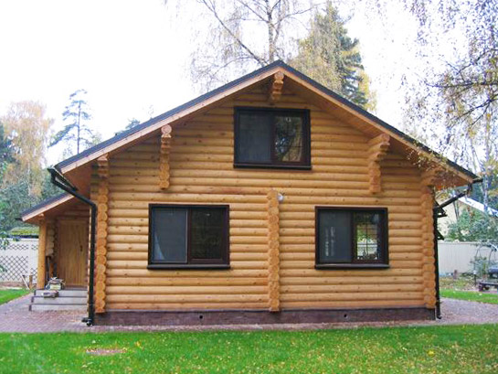 Популярный проект деревянного дома из оцилиндрованного бревна. Эркер и примыкающая к нему терраса придает современный стиль этому деревянному бревенчатому дому.