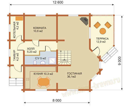 Из гостиной предусмотрен выход на террасу. Терасса имеет удобную форму и довольно большие размеры, но благодаря планировочному решению выглядит компактно и уместно.